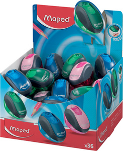 Maped Taille crayon boîte Clean, assorti, présentoir de 36 – en plastique, réservoir translucide, avec bouchon de protection – fermeture automatique après utilisation, couleurs assorties: rose, vert et bleu en paquet de 36 pièces (030111) intérieur taille-crayon en plastique, dimensions présentoir: (L)145 x (P)128 x (H)105,5 mm