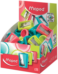 Maped Taille-crayon Vivo, en plastique, présentoir de 36 – pour crayons jusqu’à 16 mm de diamètre, petit format conve- nant bien aux trousses d’écolier, insert d’affûtage en plastique, couleurs assorties en vert, turquoise & rouge en paquet de 36 pièces dans un présentoir (062911) dimensions : (L)32,7 x (P)23,4 x (H)24,4 mm,