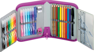 Maped Trousse Fairy, en polyester, rose, garni – contenu: 14 feutres, 2 crayons HB, 8 crayons de couleur triangulaire, 1 gomme Domino, 1 taille-crayon Boogy, 2 stylos bille ICE, 1 règle plastique 150 mm, 1 équerre 45 degrés, 1 équerre 60 degrés, sur carte blister (967812) dimensions: (L)140 x (H)210 mm