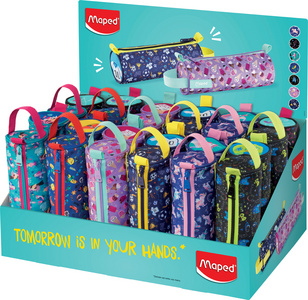 Maped Trousses rondes, présentoir de 24 – en polyester, avec fermeture éclair, avec anse, diamètre: 80 mm, longueur: 235 mm, assorti dans les motifs Licorne, Stars, Tropical, Yummy, Foot, Gaming, Skate contenu: 24 pièces (932902)