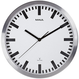 MAUL Horloge murale/horloge radio MAULpilot, diamètre: 300mm – argent, synchronisation automatique, fonctionnement à pile, y compris une pile AA, cadre en aluminium brossé, traits noirs, cadran en blanc (9063308)