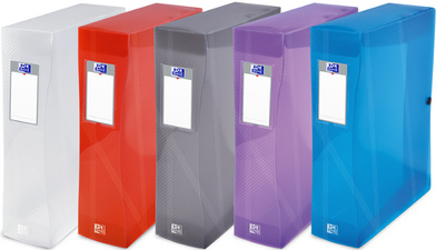 Oxford Boîte de classement HAWAI, A4, dos: 80 mm, assorti – surface au grain ligné, en PP translucide, épaisseur: 0,07mm avec bouton de fermeture, porte-étiquette et étiquette réversible, pour le format A4, dos de forme ergonomique en paquet de 8 pièces (100200178) assorti dans les couleurs: bleu, gris, incolore, rose, violet