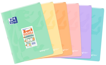 Oxford Cahier piqûre EasyBOOK Pastel, 240 x 320 mm, assorti – —————– pour le marché: F ———————— cahier 3 en 1, 96 pages, papier 90 g/m2, extra blanc, couverture plastique, avec 2 pochettes de rangement, marque page, coloris assortis -> pas de choix de couleur possible ! (400145245) assorti en vert pastel, jaune pastel, orange pastel, rose pastel, violet pastel, bleu pastel