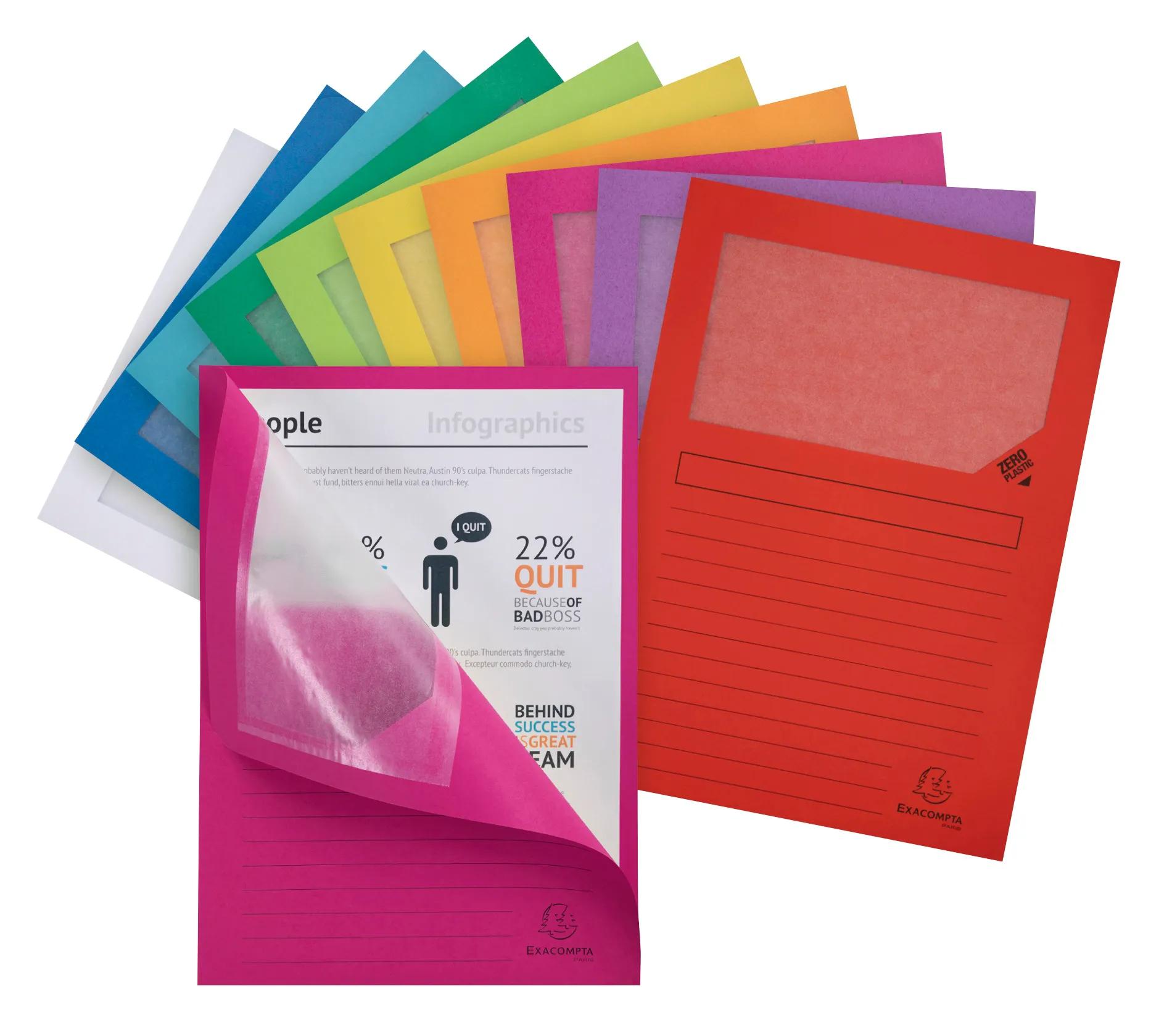 Les chemises à fenêtre d’Exacompta sont maintenant entièrement conçues en papier. La fenêtre de visualisation est désormais en papier calque au lieu de l’ancien film plastique. Un vrai progrès pour limiter notre consommation de plastique et nos déchets nocifs pour l’environnement.