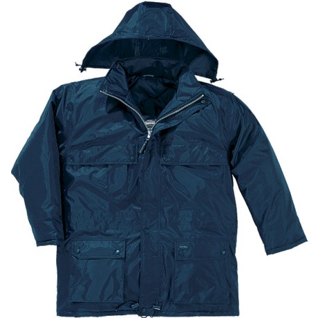 Parka en polyester avec enduction PVC Parka bleu marine avec doublure polyester matelassée, capuche fixe avec rangement, fermeture devant par zip avec rabat pression et 8 poches extérieures. Taille et bas serrés par cordon. Poignets coupe-vent. Coutures étanchées. 160 g/m². Tailles : S, M, L, XL, XXL, XXXL