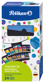 Pelikan Boîte de peinture ProColor 735, 24 couleurs – noir/bleu, 2 bacs à eau amovibles, 24 coupelles de peinture, palette de mélange amovible, contenu: 3,5 ml par coupelle et 7,5 ml de blanc opaque, pinceau compris, couleur de la boîte: noir, bacs d’eau: bleu (nouveau: 300008244 / ancien: 701228)