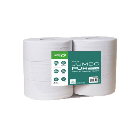 Maxi Jumbo Pur 350GM est un papier hygiénique en rouleau de 350 m pour distributeur type grand jumbo. Fabriqué en pure ouate de cellulose blanche double épaisseur avec une texture lisse moletée pour vous offrir une meilleure absorption. Il possède un grand mandrin de 7,6 cm de diamètre.