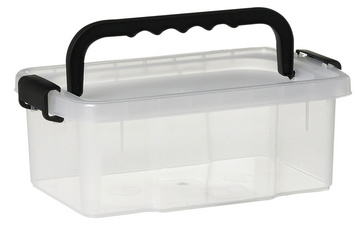• boîte transparente avec couvercle et clips de fermeture noirs