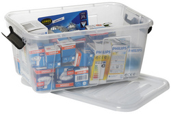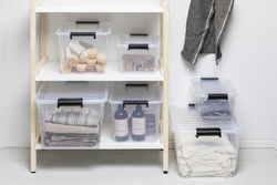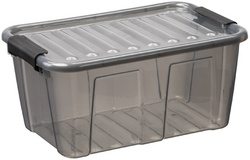 • boîte transparente avec couvercle et clips de fermeture noirs