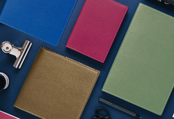 • Couverture: CLUB en matière plastique au grain 2 tons, finition surpiqûre sellier colorée, amovible, avec rabats pour y glisser des papiers