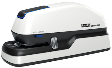 Rapid Agrafeuse électrique Optima 20E, blanc/gris/bleu – capacité d’agrafage: 20 feuilles, en métal avec boîtier en plastique, pour agrafes Optima 56, chargement frontal, fonctionne à courant ou à piles (non incluses), livré avec adaptateur et 1