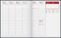 • finition : reliure cousue, division en heures de 7 à 20 heures, marqueur de jour, 2 rubans marque