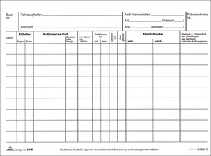 • dient der Erfassung der Fahrtstrecke, dem beförderten Gut, dem Kilometerstand bei Abfahrt, der gefahrenen Kilometer, des getankten Treibstoffes und der Mautgebühren Anwendungsbeispiele: