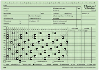 RNK Verlag Urlaubs- und Fehltagekarte 2026, DIN A5 quer – blau, Karteikarton, 190 g/qm, grafische Darstellung, Monatstage-Einteilung, mit Samstagen, Sonn- und Feiertagen, beinhaltet: 10 Karten (2900/26-10)
