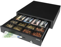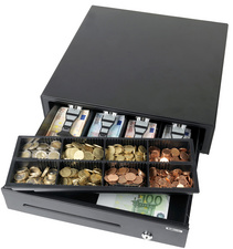 Safescan Kassenlade “LD-4141 Light Duty”, schwarz, 24 Volt – 8 herausnehmbare Münzfächer, 4 Geldscheinfächer, Einwurfschlitz an der Vorderseite, elektrische Öffnung und Öffnung mit Schlüssel, Stahlgehäuse, Maße: (B)410 x (T)415 x (H)115 mm (132-0749) RJ12 Anschluss für Quittungsdrucker und Registrierkassen