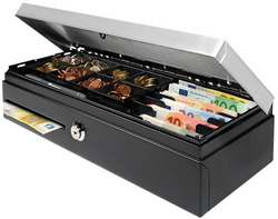 Safescan Tiroir caisse “HD-4617C Heavy Duty Flip-top”, noir – 8 bacs à monnaie / 8 bacs à billets, caisse amovible, fente d’insertion sur le côté avant, boîtier en acier, couvercle coloris argent, tiroir en plastique, couverture métallique refermable, dimensions: (L)460 x (P)170 x (H)100 mm (121-0567) connectique RJ12 pour caisses enregistreuses et imprimantes, Mikroswitch, ouverture électronique & ouverture à clé verrouillage extra solide en deux positions de clés