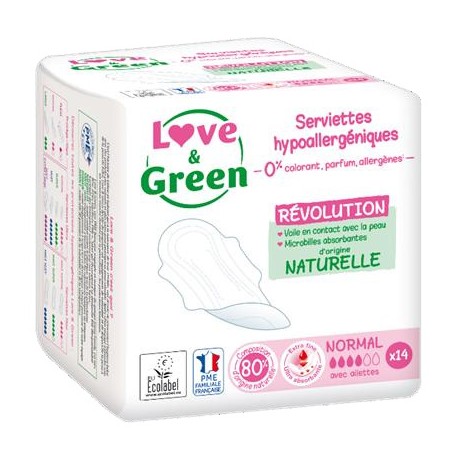 Ces serviettes hygiéniques sont composées d’un voile et de barrières en contact avec la peau d’origine naturelle. Sans Chlore, sans parfum, sans colorant, sans allergènes*, sans paraffine, sans lotion. 80 % du total de la serviette hygiénique est d’origine naturelle.