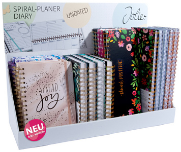 sigel Agenda BuJo Jolie, A5+, présentoir – dimensions présentoir: (L)510 x (P)180 x (H)380 mm, contenu: fronton (multilingue), présentoir vide, Carnets JP200, JP201; 2 carnets de chaque: JP203, JP204, JP205, JP100, JP101, JP103, JP104, JP105 (SF537 + SP043 + ST023 + ST042)