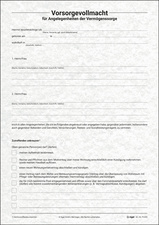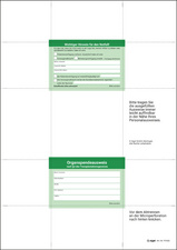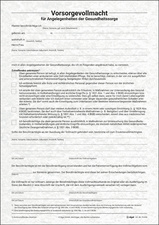 • hochweriges Urkundenpapier Inhalt: 2 Patientenverfügungen, 1 Betreuungsverfügung, je 1 Vorsorgevollmacht für die Gesundheitsvorsorge und Vermögensangelegenheiten; 2 Hinweiskarten im Scheckkartenformat (für die Geldbörse); 1 Formular für eigene Wertvorstellungen; 1 Umschlag im Format C4 mit Aufdruck; inkl. ausführlicher Erläuterungen