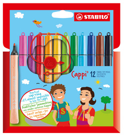 STABILO Feutre Cappi, étui en carton de 12 – lacet pour enfiler les capuchons, largeur de tracé: 1,0 mm, en forme de tube, grip ergonomique, encre facile à effacer, capuchon ventilé, peut rester ouvert 24 heures sans sécher, contenu: 12 pièces (168/12-4) assorti dans les couleurs: jaune, marron, lilas, rouge carmin, rose, noir, rose, vert émeraude, bleu azur, orange, vert clair, bleu outremer