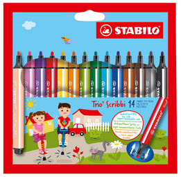 STABILO Feutre Trio Scribbi, étui en carton de 8 – largeur de tracé: 1,5 – 2,0 mm, forme triangulaire, pointe amortie, lavable, manche à la couleur du tracé avec des rayures blanches contenu: 8 feutres assorti dans les couleurs: chair, rouge, orange, jaune, vert bleu, marron et noir