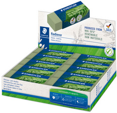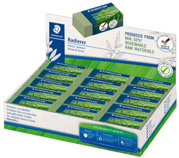 STAEDTLER Gomme, 65 x 23 x 13 mm, vert olive, présentoir 20 – avec farine végétale, composé à 56% de matières naturelles, sans phtalates ni latex, manchon fabriqué jusqu’à 100% à partir de résidus de la récolte de canne à sucre en paquet de 20 dans un présentoir (526 80-5)