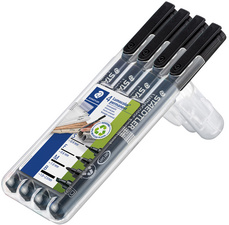 STAEDTLER Lumocolor Marqueur permanent 313S/318F/317M/314B – étui de 4, corps à 97% de plastique recyclé selon ISO 14021, couleur: noir, ineffacable et résistant à l’eau, rechargea- ble, 1x 0,4 mm (313S), 1x 1,0 – 2,5 mm (314 B), 1 x 1,0 mm (317M, 1 x 0,6 mm (318F) contenu: 4 pièces (31-9WP4GS) pointe ogive dans un étui chevalet STAEDTLER Box, corps noir / embout et capuchon à la couleur de l’encre >> aussi utilisable comme marqueur OHP et CD << --- Marqueur permanent Lumocolor, assorti - étui de 4 pièces • corps à 97 % de plastique recyclé selon ISO 14021 (corps, protection et capuchon) • DRY SAFE - peut rester ouvert plusieurs jours sans sécher • indélébile et résistant à l'eau • séchage très rapide, idéal pour les gauchers • pointe bloquée • encre permanent, inodore • la couleur noire est résistante à la lumière et aux intempéries • avec clip • effaçable sur du film transparent ou avec de l'alcool • sécurité avion: l'équilibrage automatique de la pression empêche l'encre de fuir • embout et capuchon à la couleur de l'encre • rechargeable avec le flacon -recharge 487 17 • dans une étui chevalet STAEDTLER breveté • sortiert in den Strichstärken 0,4 mm (313S), 0,6 mm (318F), 1,0 mm (317M) und 1,0 - 2,5 mm (314B) Exemples d'utilisation: - pour écrire sur des films de rétroprojection - pour écrire sur du papier et carton - pour écrire sur des films, plastique et métal - pour écrire sur du verre et la porcelaine - pour écrire sur du bois, caoutchouc et pierre - pour écrire sur CD / DVD (seulement avec une largeur de tracé de 0,4 / 1,0 mm) - pour écrire sur du polystyrène (seulement avec une largeur de tracé de 1,0 mm) - couleur noir pour utilisations extérieures Adapté pour: - élèves, étudiants et professeurs - pilotes, hôtesses de l'air et voyageurs fréquents - gauchers EAN : 4007817310083 Code fabricant : 31 -9WP4GS