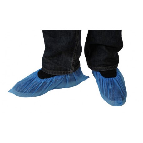 Surchaussure CPE bleue à usage unique. Protège contre la saleté, les salissures et les éclaboussures. Hygiénique, économique et étanche à l’eau.