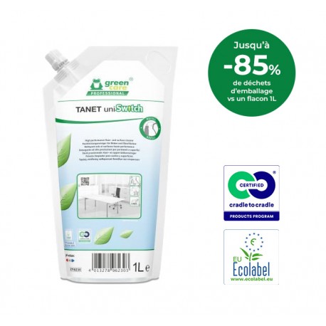 TANET uniSWITCH est un nettoyant ultra concentré développé par Green Care Professional qui élimine facilement et en seul passage les salissures présentes sur les surfaces et les sols, sans laisser de traces ni résidus. TANET uniSwitch convient à tous les sols résistants à l’eau tels que la pierre, le caoutchouc, le linoléum, le PVC, les revêtements traités PUR, etc.