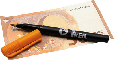 TWEN Stylo détecteur de faux billets, couleur: orange / noir – détection directe de l’authenticité, pour billets de toutes les devises, faux: le trait sur le billet change de couleur, vrai: le trait s’estompe & devient légèrement jaunâtre, sur carte blister (111-0353) dimensions: (L)12 x (P)141 x (H)15 mm, poids: 8 g