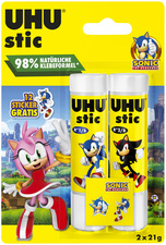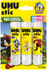 UHU Bâton de colle stic SONIC, 3 x 21 g, blister – bâton de colle aux motifs SONIC, sans solvant, capuchon à vis, facilement lavable, 98% de composants d’origine naturelle, récipient en plastique recyclé à 50% contenu: 3 bâtons de colle de 21 g (9000329/7006044)