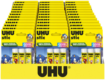UHU Bâton de colle stic SONIC, 3 x 8,2 g, présentoir de 36 – bâton de colle aux motifs SONIC, sans solvant, capuchon à vis, facilement lavable, 98% de composants d’origine naturelle, récipient en plastique recyclé à 50% contenu: 36 cartes blister de 3 bâtons de 8,2 g (7006082/9000336)
