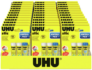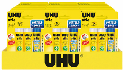 UHU Présentoir scolaire 2025: colle stic + stic Magic – avec bouchon à vis, facile à laver, sans solvant, colle papier, carton, étiquettes & polystyrène, carte blister avec 2 bâtons de colle 21 g + 1 bâton de colle Magic blue 21 g contenu: 24 cartes blister (64510 / 45290)
