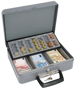 WEDO Coffret-caisse à monnaie standard, en tôle acier, gris – ————- pour le marché: D / F / NL / A / L ———– avec poignet de transport, pour monnaie et billets, capacité d’encaisse: 137,60 EUR, fermoir de sécurité cylindrique, 2 clés incl