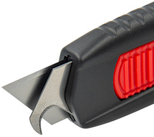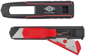 WEDO Cutter de sécurité Double Side, noir/rouge – 2 lames en un tour de main – sans changement, boîtier plastique, guide-lame en métal, avec lame 19 mm et lame crochet, retour de lame automatique, zone de préhension caoutchoutée, incl