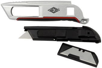 WEDO Cutter de sécurité Left/Right, lame trapèze – argent/noir/rouge, lame à ressort – se rétracte automatique- ment, boîtier en aluminium avec zone de préhension en caout- chouc & magasin pour lames, pour droitiers & gauchers, livré avec 2 lames de rechange, (78 814) dimensions: (L)150 x (P)16 x (H)33 mm