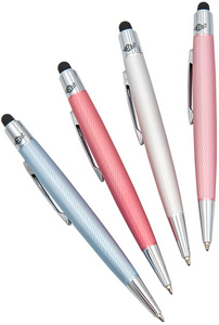 mit Struktur-Oberfläche, je 4x farbig sortiert in hellblau, dunkelrosa, hellrosa & silber, leitfähiger Stift mit Kugel- schreiber, Länge: 100 mm, inkl. blauer D1 Metallmine gepackt zu 16 Stück im Disp