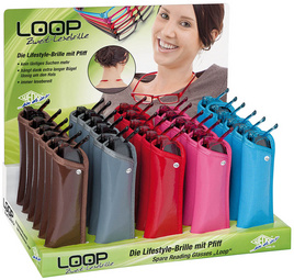 WEDO Lunettes de lecture LOOP, présentoir de 30, assorti – avec longues branches – peut être accroché au cou, verre en plastique en 4 corrections (1,5 à 3,0), monture en couleur, dans un étui en couleur adapté, contenu: 30 pièces (271 13099) dimensions du présentoir: (L)251 x (P)170 x (H)330 mm assorti dans les couleurs: rose, bleu et rouge