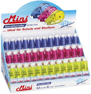WEDO Mini roller correcteur, 4,2 mm x 6 m, présentoir de 36 – reécriture immédiate, sans solvant, boîtier en plastique recyclable, dimensions présentoir : (L)205 x (P)115 x (H) 200 mm, assorti dans les couleurs bleu, vert et rose, en paquet de 36 pièces (257 0420699)