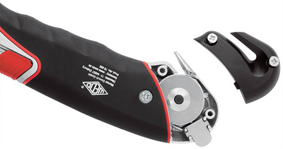 • sécurité grâce au rétrait automatique de la lame: les lames sont équipées de ressorts et disparaissent automatiquement lorsque la lame glisse de l’objet (ne pas toucher le manche pendant la coupe)