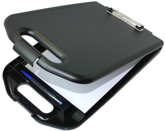 Wonday Porte-bloc avec module de rangement, A4, noir – pince plate sur le couvercle, ouverture de la pince: 3 mm, boîte en plastique de haute qualité avec poignée de transport, fermeture à clip, dimensions: (L)255 x (P)400 x (H)50 mm (GPB240061)